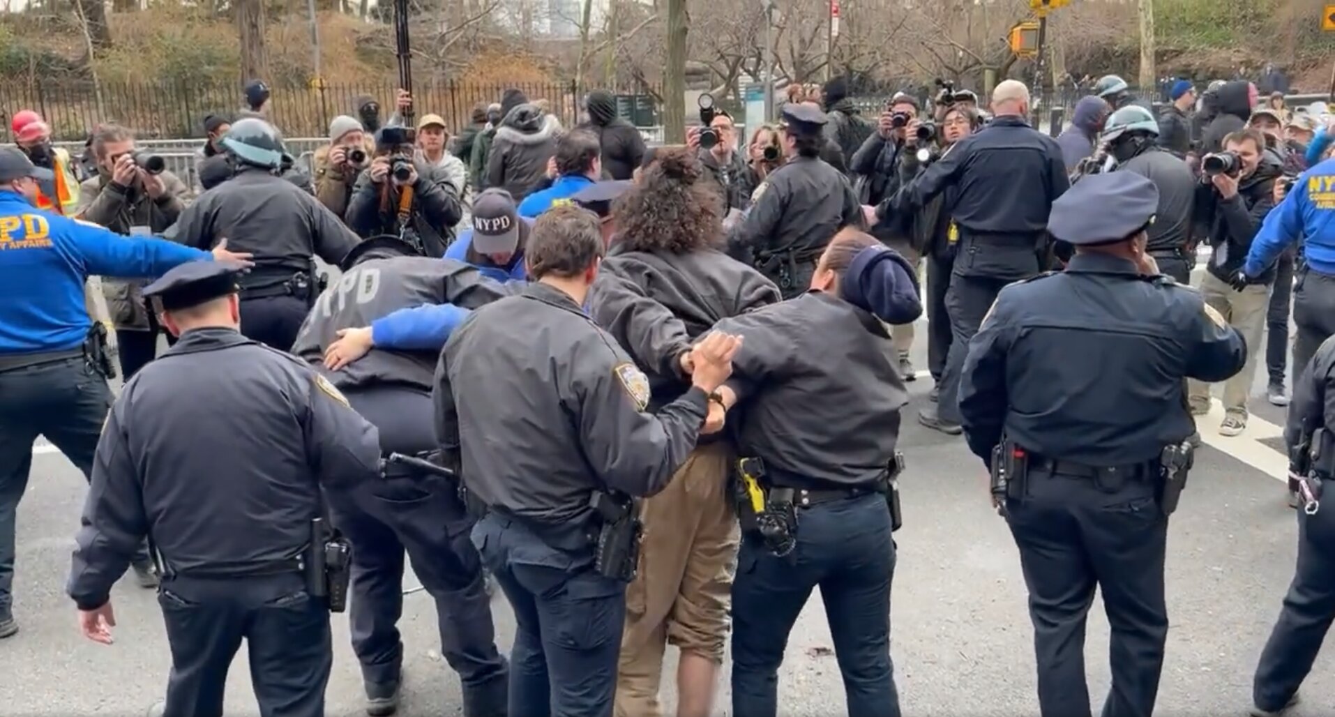 In the most alarming moment of the afternoon, an individual ran toward the crowd holding a device that was emitting smoke. Police tackled the person and took him into custody, and the surrounding area was evacuated while the bomb squad investigated. The NYPD said two devices were recovered at the scene, and authorities believe at least one was a smoke bomb. No explosion occurred and no injuries were reported.Lang and his supporters attempted to leave in the U-Haul, but counter-protesters surrounded the vehicle, punching it and using their bodies to block its path. Lang was ultimately escorted from the area by the NYPD’s Strategic Response Group.