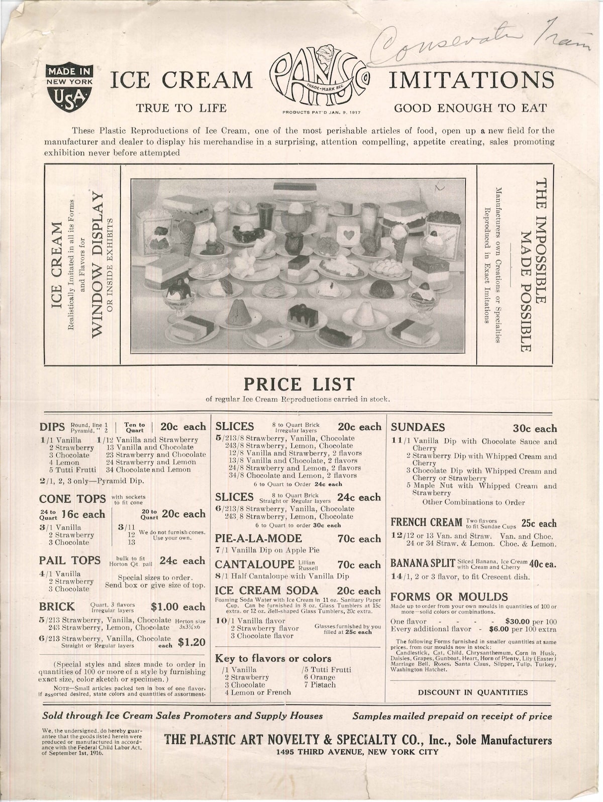 U.S. Food Administration. Pennsylvania State Food Administration. Division of Conservation. 8/1917-2/1919. The Plastic Art Novelty And Specialty Company Ice Cream Imitations Advertisement. 1917-09-01/1918-10-31. Retrieved from the Digital Public Library of America.