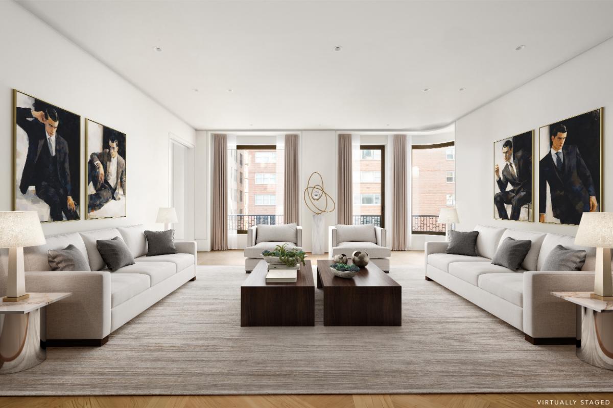 A semi-private elevator opens into a limestone-clad entry gallery, leading into a Madison Avenue-facing living room with oversized windows, soaring 10-foot ceilings, and custom Parquet de Versailles white oak flooring. The dramatic main living space measures more than 24 feet wide and offers open streetscape views along Madison Avenue.