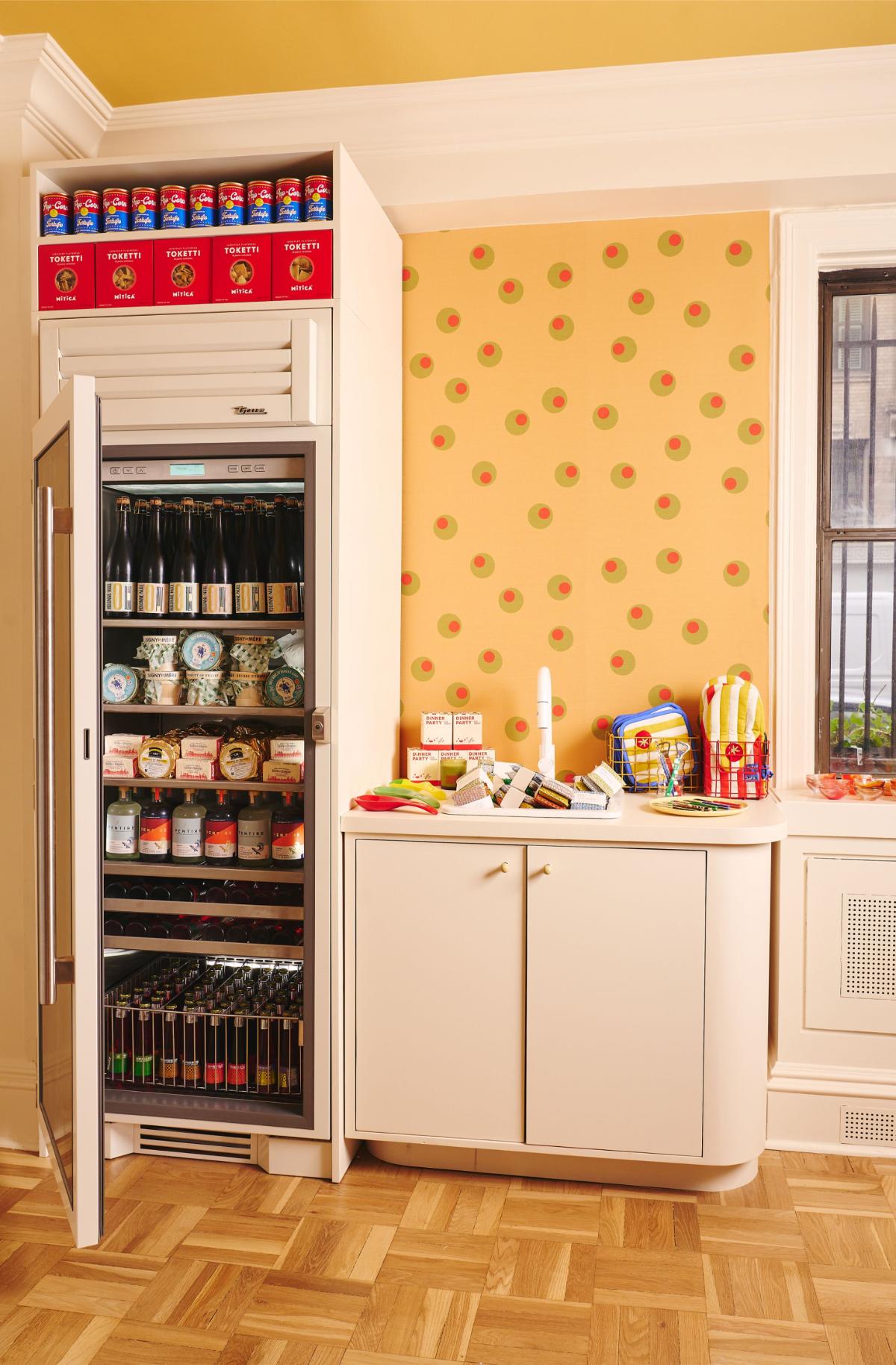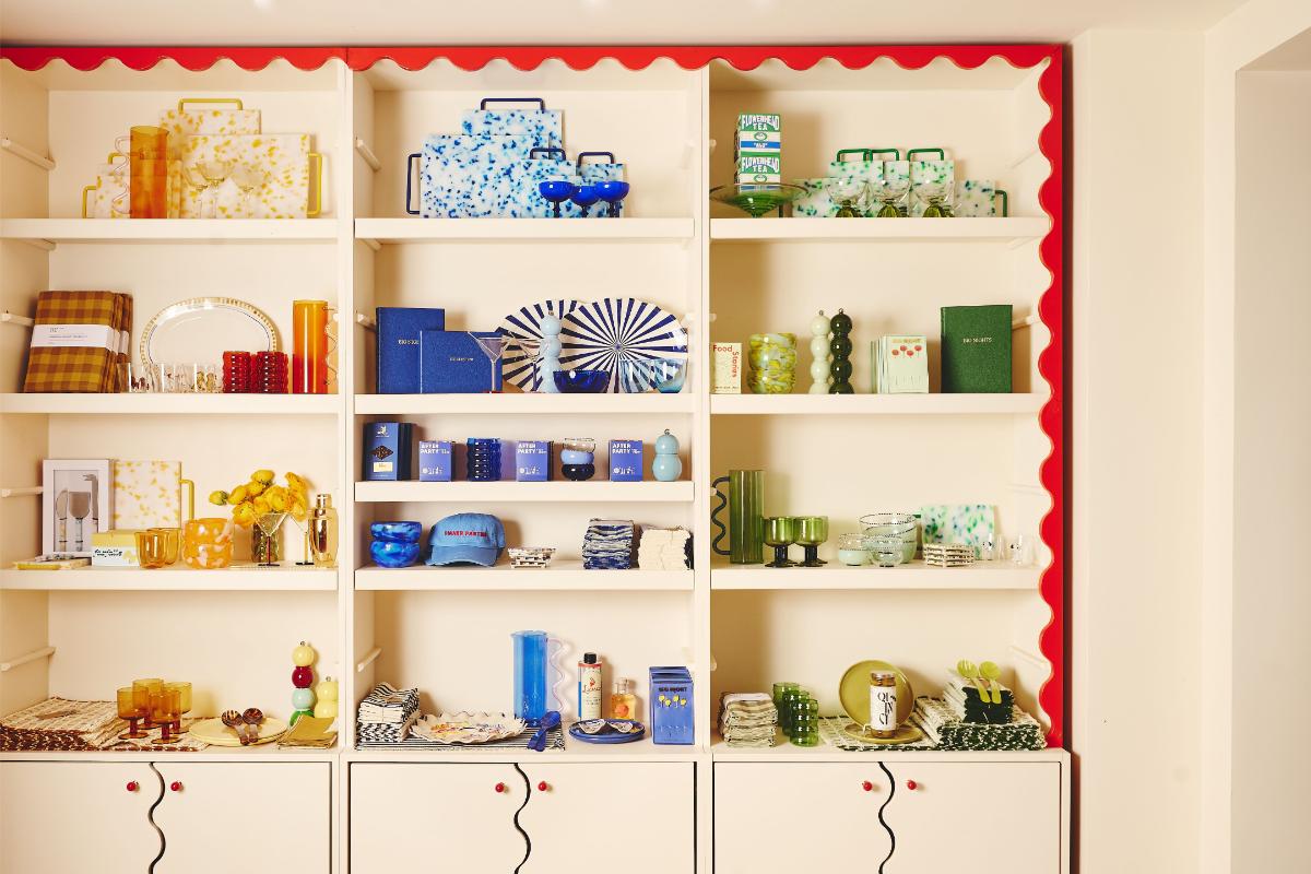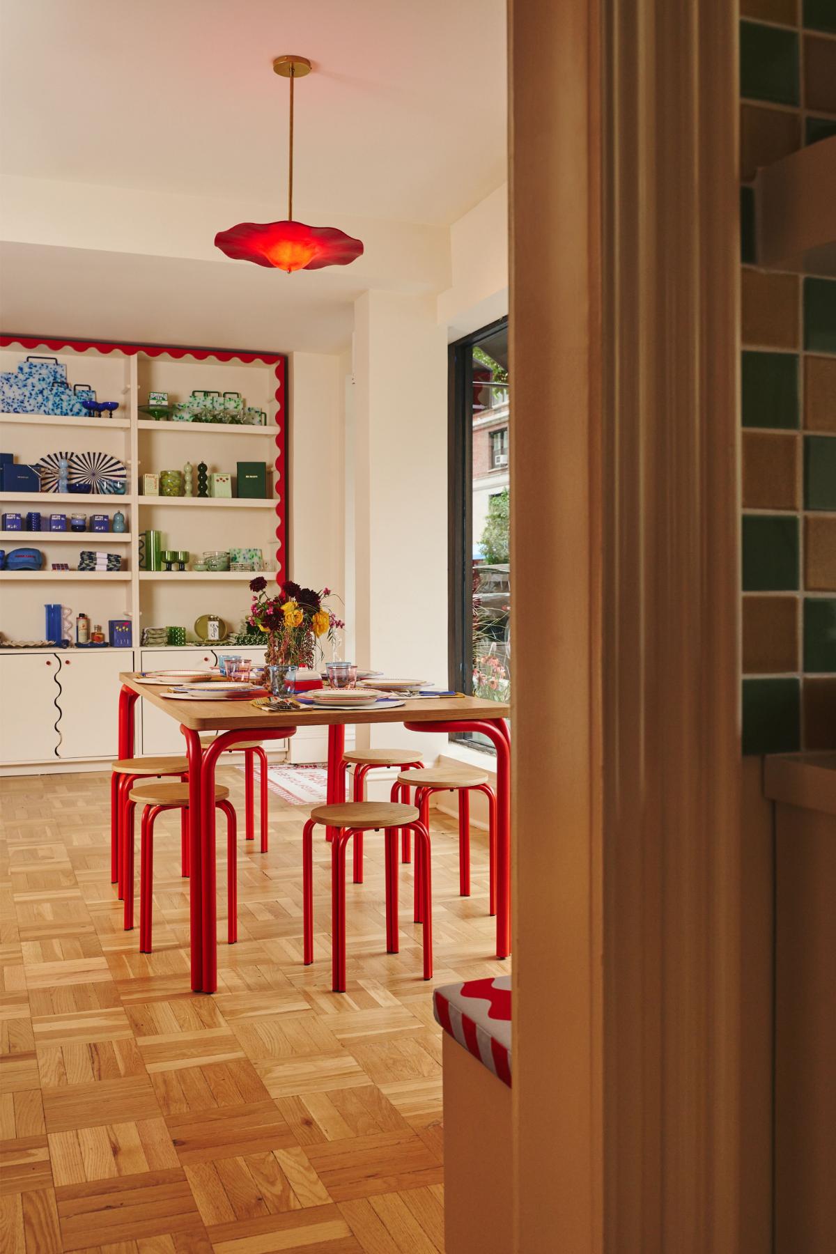 The 900-square-foot space is designed to feel like a shoppable apartment, complete with a sun-filled kitchen, a built-in bar for glassware, and a pantry stocked with curated goods. Colorful details—like a green-and-yellow checkerboard floor and a burgundy bar—reflect Big Night’s signature playful aesthetic while giving the space an uptown polish.